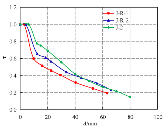 Figure 14 presents the stiffness degradation curve of the specimen; τ is the normalized stiffness degradation coefficient, defined as τ = Ki/K0, where Ki is the secant stiffness under various loading levels and K0 is the initial stiffness. Figure 14 shows that the stiffness degradation rate of specimen J-R-2 was slower than that of specimen J-R-1, because the damage in the precast beam due to crack development was stable after the previous test and the stiffness degradation of specimen J-R-2 was mainly caused by the damage in flange energy-dissipating steel plate. The stiffness degradation rate of specimen J-2 was slower than that of specimens J-R-1 and J-R-2, mainly because specimen J-2 had shear cracks in the beam, and finally the shear failure of the precast beam occurred. Furthermore, the shear stiffness of the precast beam was relatively high, and the stiffness degraded slowly.