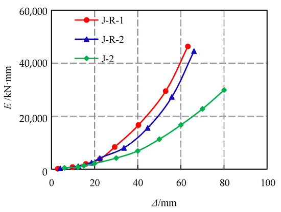 The hysteretic curve of the assembled steel sleeve confined concrete joint specimen J-2 had serious pinching effecting under cyclic loading, as presented in Figure 10b. The bearing capacity of specimen J-2 was smaller than specimens J-R-1 and J-R-2, also resulting in a relatively poor energy-dissipation capacity.