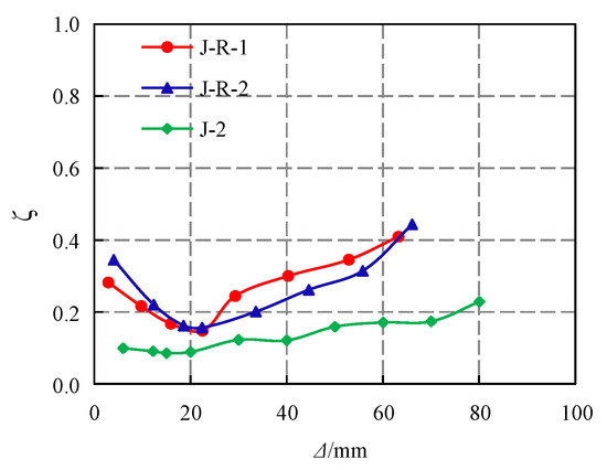 Figure 15 shows the cumulative hysteretic energy dissipation of the tested specimens, and Figure 16 presents the equivalent viscous damping coefficient ζ. From Figure 15, it was analyzed that the total energy dissipation of specimens J-R-1, J-R-2, and J-2 were 46,334 kN·mm, 44,519 kN·mm, and 29,856 kN·mm, respectively. The energy consumption of specimens J-R-1 and J-R-2 were about 1.55 times and 1.49 times of that of specimen J-2, respectively, indicating the adoption of steel hinge could greatly improve the energy-dissipation behavior. The cumulative hysteretic energy-dissipation curves of specimens J-R-1 and J-R-2 were similar but the accumulated hysteretic energy dissipation of specimen J-R-1 was slightly worse than that of specimen J-R-1, since specimen J-R-2 worked with cracks in the precast beam. It was found that the equivalent viscous damping coefficient curves of specimens J-R-1 and J-R-2 were basically the same, as presented in Figure 16. The maximum equivalent viscous damping coefficient of specimens J-R-1, J-R-2, and J-2 were 0.41, 0.44, and 0.23, respectively. In conclusion, it showed that the energy-dissipating steel hinge had good energy dissipation capacity, which could improve the energy-dissipation behavior of the precast replaceable beam-to-column joint with energy-dissipating steel hinge. Moreover, the replacement of damaged steel plates in the steel hinge could effectively restore the energy-dissipating ability.