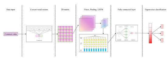- CNN-BiLSTM. As a deep neural network classification model commonly used in large-scale Internet corpus and natural language processing algorithms, the LSTM model is particularly suitable for modeling time series data because of its characteristics [48,49]. It can capture longer-distance dependencies to associate words in context, but unidirectional LSTMs fail to encode back-to-front information when dealing with finer-grained classification tasks. In this paper, the forward and backward LSTMs are combined to form a bidirectional long short-term memory recurrent neural network (Bi-LSTM), which can better capture bidirectional semantic dependencies [50]. However, using this model directly may result in an excessive computational overhead because of the high input dimensionality. Therefore, this paper considers using a CNN to reduce the dimension of the word vector matrix formed by the original data, and integrates the BiLSTM model for sentiment analysis, thereby improving the operating efficiency and prediction accuracy of the model [51]. The model construction sequence is as follows: text data input, word vector representation, mapping into a two-dimensional matrix, architecture layer (including filter, pooling layer, etc.), fully connected layer, and feature vector representation and classification. The output of each layer is the input to the next layer. Specifically, Word2Vec is used to train the comment data, and the obtained word vector matrix is used as the input of the convolution layer. The convolution layer uses the filter to perform the convolution operation on the word vector matrix of the comment data to generate a feature map. The feature map is sampled, and the most important features in the map are extracted and passed to the fully connected layer. Finally, the fully connected layer obtains the sentiment polarity of comments through the SoftMax function and outputs the final classification result of the sentiment tendency of Weibo comments [50]. The specific model architecture is shown in Figure 2.