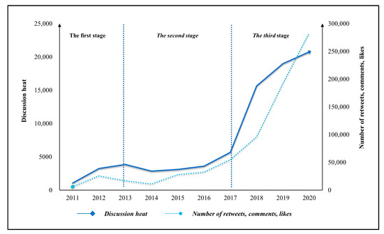 Figure 3 shows the trend of the discussion on the topic of “smart city” on Sina Weibo and the changes in the number of likes and comments are generally similar. The public opinion cycle can be divided into three stages according to the development of public opinion. In the first stage (2011–2013), 2011 was the initial discussion stage on Sina Weibo about the topic of “smart city.” from 2011 to 2013, the discussion of related topics exploded and reached a peak for the first time in 2013, followed by a gradual oscillation stage of topic heat. The topic of “smart city” has been noticed by the public for the first time and aroused heated discussions, and the amount of discussion gradually increased. With the development of the expansion of the scope of public participation, the audience of the topic differed in terms of environment, identity background, intellectual level, etc. There are also different interpretations of the information on “smart cities” [25]. In the second phase (2014–2017), public discussion about smart cities fluctuated since 2013, and in 2017, the discussion heat rose to about 5000, with more than 50,000 comments and likes. However, public attention is limited at this stage, and the popularity of public opinion fluctuates slightly and remains at a relatively low level. In the third stage, with the government’s increasing emphasis on the concept of smart city, the central ministries and commissions issued nearly 100 policy documents related to the smart city around 2016, which raised the public awareness of the concept of smart city [53,54]. The discussion heat on the topic of “smart cities” exploded in 2018, the topic was discussed with more than 20,000 heat and nearly 300,000 comments and likes. The demand for knowledge and information has led to a rapid increase in public discussions on the topic of “smart cities.” To sum up, the distribution of public opinion hotspots in the time series reflects the logic of the public’s psychological demand for smart cities, that is, from the early pursuit of the novelty of smart cities to the confusion and doubts on some practices in the promotion and construction of smart cities. Finally, with the policy-driven and successive application, the concept of “smart city” has gradually been recognized and accepted by the public.