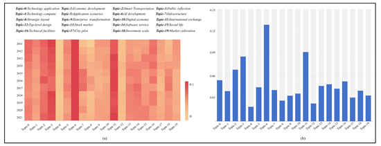 This paper calculates the average of all the theme probabilities based on the document-topic distribution, and the results are shown in Figure 4. Figure 4a shows the heat map of theme intensity, and Topic #6 (AI development) and Topic #11 (International exchange) both maintain high-intensity values for 2011–2021. The development of AI and the comparison and exchange with other countries’ smart city construction have been topics of more public concern in the process of smart city construction. In addition, the intensity values of Topic #3 (Public reflection) and Topic #2 (Smart transportation) are also at a high level. The intensity values of Topic #12 (Top-level design) and Topic #4 (Technology company) are low, which also indicates that the public is not active in discussing topics, such as government policy planning about smart cities and information technology companies, and from the side, it can also reflect the lack of government efforts to promote and publicize policies related to smart cities. The study compared the average intensity value of each topic for 2011–2021 to compare the intensity level of each topic more intuitively and the ranking results are shown in Figure 4b. The horizontal axis is the topic category and the vertical axis is the probability value. Among them, Topic #6 (Artificial Intelligence development) has the highest average probability, followed by Topic #11 (International exchange), and Topic #3 (Smart transportation). Topics with lower probability values are Topic #4 (Technology company), Topic #12 (Top-level Design), and Topic #8 (Strategic layout).