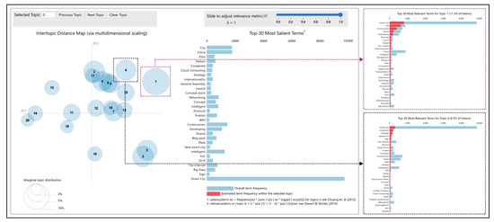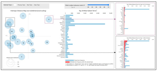 Figure 5, Figure 6 and Figure 7 show the 20 circles on the left side of the figure representing the 20 topics obtained by the LDA model, and the histograms on the right side that represent the 30 most important keywords in each topic. The area of the circle represents the relative dominance of each topic, and the distance between the circles represents the degree of correlation between the identified topics. When the distance between the circles is too close or overlapping, it can be regarded as a relatively similar topic [46], and the two histograms on the far right side of the upper and lower distributions show the keywords of the two topics. Based on these data, a brief analysis of the public perception of the topic of “smart city” in different periods can be made.
