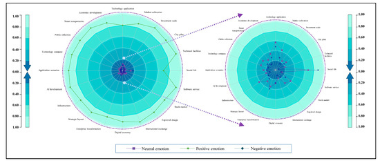 To see the distribution of sentiment polarity in each topic more intuitively, the research summarizes the distribution of sentiment polarity for each topic, as shown in Figure 8. From Figure 8, it can be found that the public’s perception of smart cities is generally dominated by positive emotions. In the distribution of emotional polarity corresponding to each theme, positive emotions have always maintained a high level of leadership, and the emotional polarity level fluctuates around 0.8. However, there are differences in the emotional tendencies of each topic. Based on the emotional scores of each topic, in the positive comments, intelligent transportation, AI development, international exchanges, software services, and infrastructure are the topics with higher positive scores. Among the negative comments, the negative comments focus mainly on the three themes of society and people’s livelihood, technology application, and the digital transformation of enterprises.