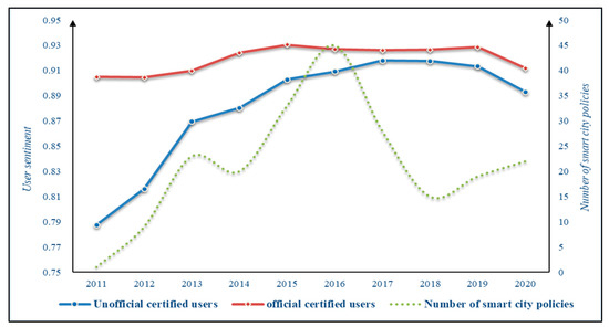 Figure 9 shows that overall, the fluctuation trend of emotion values of different types of users is roughly the same, and the public’s perception of smart cities is generally dominated by positive emotions. Specifically, from 2011 to 2015, the positive emotional intensity of the public’s cognition of smart cities increased gradually, then leveled off at 0.9. After 2017, the positive emotional intensity value gradually decreased. According to the subdivision of the different types of user groups, the emotional tendencies of Weibo officially certified user groups on the topic of “smart city” have a greater positive emotional intensity, while the emotional intensity of non-Weibo officially certified users on the topic of “smart city” is somewhat higher. Since 2011, the positive emotional intensity of this group’s perception of smart cities has risen rapidly and reached a peak in 2017. It gradually stabilized and negative emotions increased, but mainly the positive emotions dominated. In addition, to explore the relationship between policies and the public’s emotional tendencies towards the topic of “smart city,” the study collated the number of smart city-related policies issued by the central government and above from 2011 to 2020. The number of smart city-related policies issued at the national level from 2011 to 2016 showed a trend of rapid fluctuation and rapid increase, which is related closely to the evolution of the emotional tendencies of non-Weibo officially certified users. After 2016, the number of policies related to smart cities reduced drastically, and the public’s positive emotional intensity towards the topic of “smart cities” gradually stabilized and exhibited a downward trend. To sum up, this paper shows to a certain extent that the emotional tendency of users (especially those not officially certified by Weibo) toward “smart city” is related closely to the introduction of policies [60], and that the government’s timely publication of information disclosing the vision and progress of smart city construction can have a positive guiding effect on public sentiment. This trend is more significant for unofficially certified user.
