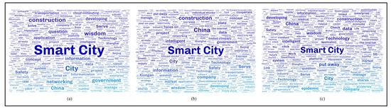 It was found that negative comments are more perceptive to the public than positive comments, mainly because negative public information about smart cities is more seductive and attention grabbing than positive information [61]. To identify the problems in the development of smart cities, analyzing negative public comments about smart city ideas often reveals more about the shortcomings of smart cities, as shown in Figure 10. The texts of negative emotions were subject to topic mining and word cloud graph analysis to explore and summarize the current public opinion demands of the public on smart city topics to investigate the topics that the groups that post negative comments are concerned about and the trend of topic evolution, based on the results of sentiment analysis, from the three stages of 2011–2013, 2014–2017, and 2018–2021.