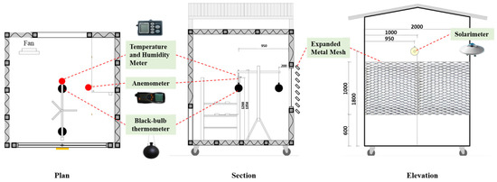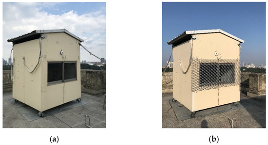 In order to verify whether the thermal environment and lighting predictions provided by the simulation software would be reproducible when the expanded metal mesh was used in the opening of a building, field measurement was carried out in the experimental house on the top floor of the Technology Building of National Cheng Kung University. The experimental house is shown in Figure 2, and the plan and section are shown in Figure 3. The experimental house is a rectangular space with an area of 200 cm (length) × 200 cm (width) × 220 cm (height). Only one facade has a window opening, which is 160 cm (width) × 80 cm (height). The bottom of the experimental house is equipped with pulleys, which can carry out solar irradiance experiments in different orientations.