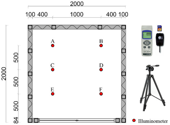The experiment also used the measured value of the experimental house to compare the reproducibility of the indoor illumination simulation. For the measurement, three different types of expanded metal mesh with 81%, 42% and 21% perforated ratio were installed in the openings; in the last case, no expanded metal mesh was installed. The openings of the experimental house face the four directions of east, west, south, and north, respectively, with a total of 16 sets of measured data. As shown in Figure 6, six illuminometers were installed. Pursuant to the working surface height standard for indoor lighting in the LEED evaluation system [25], the sensor was set at a height of 76 cm. The measurement was carried out from the end of November 2017 to January 2018. The measurement time was from 9:00 a.m. to 6:00 p.m., and the illuminometer recorded data per minute.