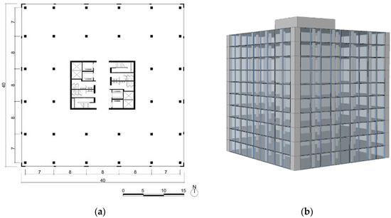 The object simulation case is a 40 m × 40 m 10-story RC structure office building, which is a medium-sized office space among the 16 building types defined by the U.S. Department of Energy [28]. The positions of the windows correspond to the positions of the columns, and the vertical traffic flow and bathrooms are concentrated in the center of the building plan. The rest of the space is flexibly arranged for office, meeting, and discussion spaces.
