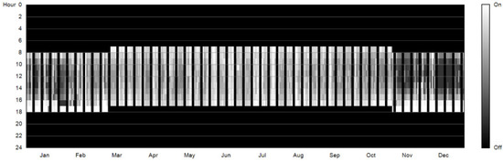 In terms of lighting control, the reduced artificial lighting due to natural lighting benefits was included in the calculation of energy consumption, and the simulation settings are shown in Table 7. The lighting switch setting adopts “Dimming with Occupancy On/Off Sensor” in the software lighting control system. To elaborate, the software first determines whether the space is being used based on the user activity time. Artificial lighting is not turned on if not in use. When users use the space, it will be judged whether to turn on artificial lighting according to the current space illuminance to reach the target illuminance value. The user activity time is set from 8:00 a.m. to 6:00 p.m. Taiwan’s national standard CNS 12112 [29] is based on ISO 8995-1 [30]. According to the recommended illuminance for office work, the target illuminance value was set to 500 lx. When the software performs its calculation, it automatically determines the lighting switch period and the lighting usage ratio and exports the lighting schedule (Figure 8). Then we imported the lighting schedule into EnergyPlus to calculate the lighting energy consumption.