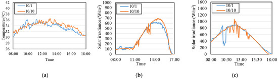 Two days with similar external conditions were selected from the multi-day measurement (Figure 9), namely, 1 October 2017 (without expanded metal mesh) and 10 October 2017 (with expanded metal mesh). The field measured data of these two days were compared with the simulated values of EnergyPlus.