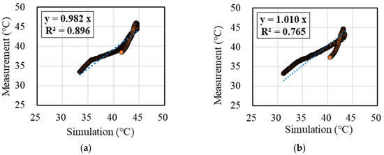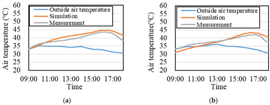 Air temperature comparison of simulation and measurement. (a) Without Expanded Metal Mesh; (b) With Expanded Metal Mesh.