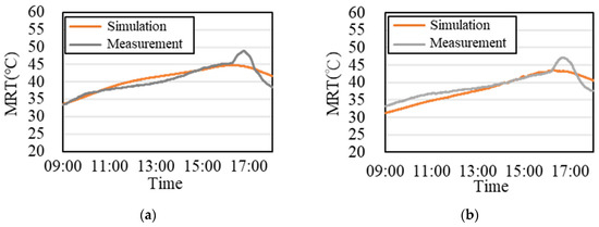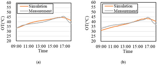 Figure 10, Figure 11 and Figure 12 compare various indoor conditions with and without expanded metal mesh. When the expanded metal mesh was not installed, the measured results show that the air temperature and the MRT had the same trend, but the MRT suddenly rose between 16:00 and 17:00, since it is calculated using air temperature, black bulb temperature, and wind speed. However, the measurement results showed no sudden rise in the air temperature, and the wind speed was always less than 0.2 m/s, so it is speculated that this phenomenon is caused by the increase in black bulb temperature. This rise is due to the angle of incidence of sunlight near evening being larger; that is, the sunlight can directly irradiate the black-ball thermometer. Although this phenomenon is difficult to reproduce on EnergyPlus, the predictions of air temperature, MRT, and OT are consistent with the overall trend of the measurement. In particular, the measurement and simulation of OT has a high correlation (Figure 13), R2 > 0.76. Furthermore, the maximum root mean square deviation (RMSD) is about 1 °C, showing good reproducibility for simulations with EnergyPlus.