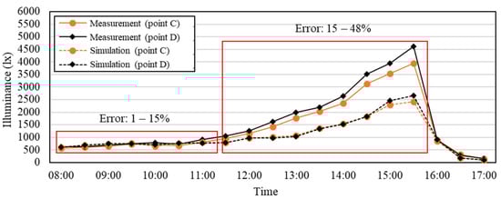 The results of DIVA simulation and measurement are compared in Figure 14. The measurement and the DIVA simulation have the same trend. However, during the period of direct sunlight on the opening (12:00–15:30), the error between the measurement and the simulation of the illuminance is relatively large, whereas the error is relatively small during the period of more diffuse light. In addition, we found that when the measured illuminance was below 1000 lx, the accuracy of DIVA simulation was quite high, and all errors were less than 15%. However, when the measured illuminance was above 1000 lx, the DIVA simulated illuminance was too large or too small for evaluation, and the overall error was within 48%.