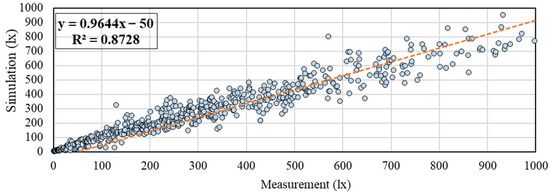 Figure 15 shows the scatter plot with measured illuminance less than 1000 lx from all cases. The results demonstrate that when the measured illuminance is less than 1000 lx, the simulation and measurement have a high positive correlation and accuracy (R2 = 0.87). Since we also discuss the office work environment with the illumination range below 1000 lx, this result can prove that when the measured value is less than 1000 lx, regardless of the orientation of the building openings, the installation of expanded metal mesh with different perforated ratio, or no shading devices, the simulation of DIVA with regard to indoor illumination is reproducible and accurate.