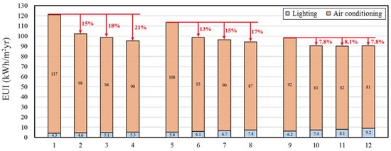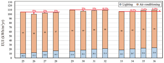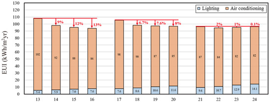 Figure 17, Figure 18 and Figure 19 show the energy consumption simulation results of lighting and air conditioning when the WWR = 80%, 50%, and 30%, respectively. The horizontal axis is the simulation case number, and the vertical axis is the EUI. As shown in the 36 simulated cases, the higher the WWR, the higher the EUI. The energy saving potential of expanded metal mesh and glass is highly related to WWR; that is, the greater the WWR, the greater the contribution of the two to energy saving.