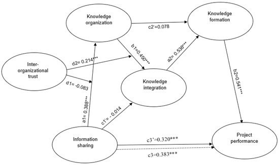 Adopting knowledge management theories from an inter-organizational perspective, this study aims to uncover the relationships among information sharing (IS), knowledge organization (KO), and knowledge integration (KI) through knowledge formation (KF) for improving complex infrastructure project performance. Two hundred and thirty-four valid questionnaires were collected from organizations involved in complex infrastructure projects, and their responses were evaluated using partial least-squares structural equation modeling. The findings show that IS has a significant effect on the improvement of project performance and manifests as multiple mediation roles through KO, KI and KF, not via the direct effect of IS on KI and that of KO on KF. Inter-organizational trust also plays a new and positive moderating role in the relationship between KO and KI, not in the relationship between IS and KO. This study not only provides insights on the practice of knowledge management for improving complex infrastructure project performance, but it also discovers new pathways of knowledge management and relational governance through project-specific knowledge formation.