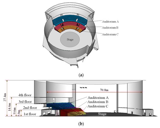 Based on the Chongqing 1949 Grand Theater in Ciqikou, Chongqing, a 3D model was established, as shown in Figure 1a. The total height of the theater building is 28.4 m, the overall shape is cylindrical, the height from the ceiling to the ground is 27.4 m, and the diameter of the internal cylindrical space is about 70.8 m, as shown in Figure 1b. Theater buildings can be divided into stage areas and other areas. The stage area is the ground floor and the local areas including the auditorium, backstage, rehearsal, and equipment room are four floors above ground. There is a round stage area in the center of the stage area. The total construction area is 25,315.34 m2. The auditorium is designed with 1497 seats.