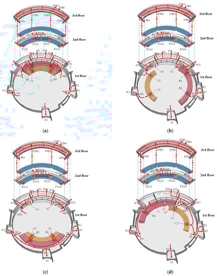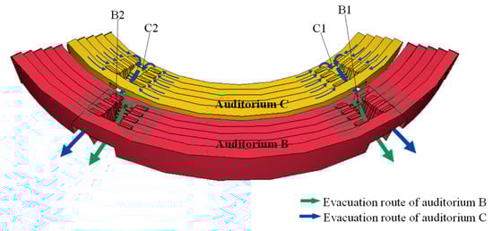 However, for the rotatable auditorium B and C, the relative position of the auditorium exits and the evacuation routes will change with the rotation angle. People in auditorium B and C need to go through the exits behind the auditorium to complete the evacuation, as shown in Figure 3. When the evacuation exits B1, B2, C1, and C2 of auditorium B and auditorium C are fully or partially connected, the audience of auditorium C can complete the evacuation through the evacuation exit under auditorium B, as shown in Figure 2a,c. Similarly, when the evacuation exits B1 and B2 of auditorium B are connected or partially connected with the evacuation exits A1 and A2 on the first floor, the audience of auditorium B can complete the evacuation through the evacuation exits A1 and A2, as shown in Figure 2a. In some cases, the evacuation exit of the auditorium may be blocked due to the dislocation of the rotating structure. For example, exit A1 and exit B1 in Figure 2d are blocked due to the movement of auditorium B.
