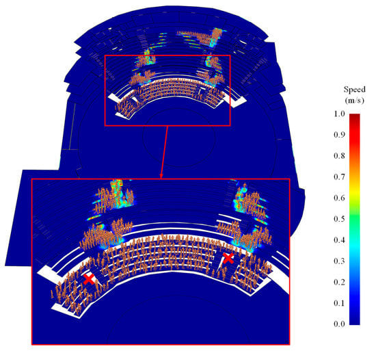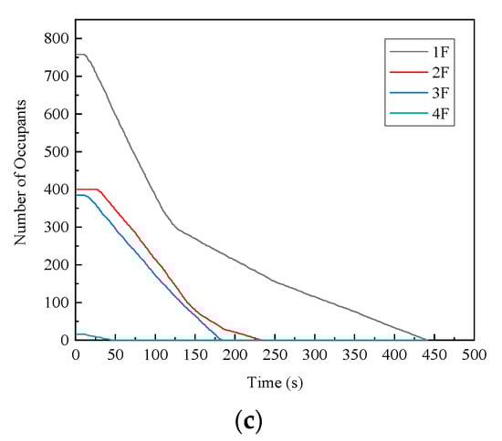 Figure 21 shows the evacuation process and the density distribution on the first floor after adding emergency evacuation stairs, taking Case 40A as an example. In Case 40A, evacuation exits C1 and C2 of auditorium C were blocked, which made it impossible for people in auditorium C to evacuate. Evacuation exit B2 of auditorium B is also blocked, so that all audience members can only evacuate through exit B1, which greatly affects the evacuation efficiency. After adding the emergency evacuation stairs, the audience in auditorium C can quickly reach the stage through the emergency evacuation stairs, and the audience in auditorium B near the right side of the audience can also quickly reach the stage through the stairs, as shown in Figure 21b,c. All people on the first floor evacuate to the outside in 234.3 s, which greatly shortens the evacuation time, as shown in Figure 21d.
