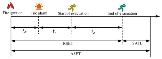 The evacuation time is composed of three parts, namely , and , as shown in Figure 5. RSET can be expressed as follows: