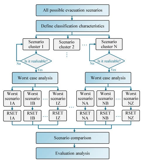 The SFPE Engineering Guide to Performance-Based Fire Protection gives the process of performance-based fire protection design, including defining project scope, identifying goals, defining objectives, developing performance criteria, developing fire scenarios, developing trial designs, and evaluating trial designs. A two-step process is proposed to identify and design fire scenarios []. The first step is to consider all possible scenarios for a building within the design envelope. The second step is to reduce the number of possible scenarios to a manageable set of design scenarios. Scenarios can be grouped into similar clusters of scenarios based on defined characteristics. Based on this idea, a systematic approach to identify the worst evacuation scenes is proposed in this work to address the problem of randomness in evacuation scenes. The overall framework for identifying evacuation scenarios is shown in Figure 6. It mainly consists of the following steps: (1) sorting out all possible evacuation scenarios; (2) defining classification characteristics; (3) obtaining scenario clusters and verifying their achievability; (4) identifying the worst scenarios in each scenario cluster; (5) determining the RSET of each worst scenario through evacuation simulation; (6) performing evacuation evaluation analysis.