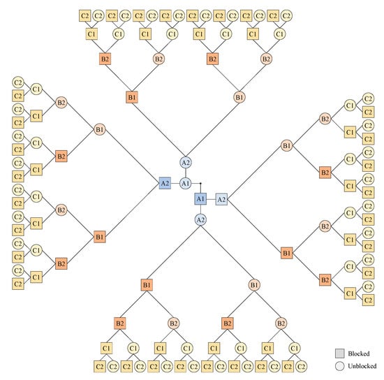 In order to clearly identify evacuation scenarios, classification characteristics need to be defined first. As described in Section 2.2, the blockage of the evacuation exit has a decisive impact on the evacuation path. In this regard, all possible scenarios can be classified according to the evacuation blockage of evacuation exits A1, A2, B1, B2, C1, and C2. The analysis relationship diagram for the classification of evacuation scenario clusters is shown in Figure 7, where a square indicates that the exit is blocked and a circle indicates that the given exit is not blocked. In order to clearly explain the classification criteria, “circle A1-square A2-circle B1-circle B2-circle C1-circle C2” in Figure 7 is used as an example for description. It represents a set of situations, that is, all scenarios in which evacuation exits A1, B1, B2, C1, and C2 are not blocked and evacuation exit A2 is blocked. In this paper, the set of all situations that meet this condition is defined as a cluster.