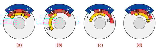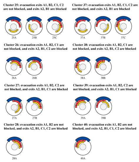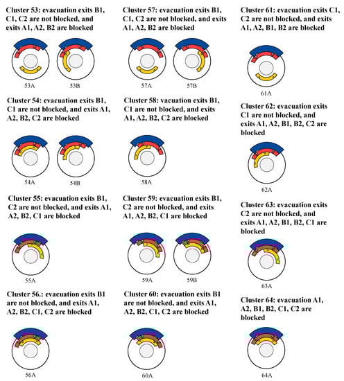 In the above classification analysis, all evacuation scenarios were classified and 24 realizable clusters were obtained. However, for every cluster of exit blockages, there are countless ways of rotating the auditorium position layout. In order to simplify the evacuation analysis and evaluate the evacuation performance, further analysis of the cluster is needed. In general, the longer the total distance it takes for everyone in a building to complete an evacuation, the more difficult it is for people to evacuate in an emergency []. Therefore, based on this principle, we can analyze the relative positions of auditorium B, auditorium C, and other exits on the first floor. For the auditorium whose location cannot be determined, the situation that the auditorium evacuation exits are relatively farthest from the theater exits must exist, that is, the relatively longest evacuation path must exist. According to the above classification principles, each cluster is further analyzed and one or more typical rotating audience position layouts are obtained to determine the most unfavorable evacuation scenarios.