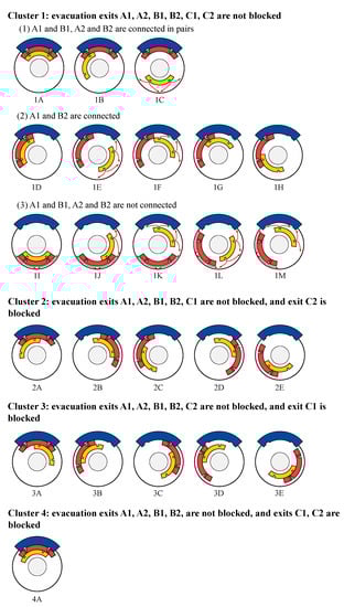 By listing all the evacuation scenario clusters, 64 ideal scenario clusters were obtained. Through further analysis, it can be found that 40 clusters cannot be achieved because the blocking between auditorium A, auditorium B, and auditorium C is interactive. For example, when the evacuation exits A1 and A2 are not blocked, it means that either auditorium B has rotated to a position far away from the evacuation exits A1 and A2, or the evacuation exits B1 and B2 of the auditorium B are just connected to the evacuation exits A1 and A2. In either case, the evacuation exits B1 and B2 of auditorium B will not be blocked, that is, it is impossible to realize a cluster in which both the evacuation exits A1 and A2 are not blocked but the evacuation exits B1 and B2 are blocked. Therefore, according to a similar rule, all unrealizable clusters were excluded, leaving 24 realizable clusters in the end.