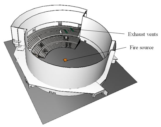 The location of the fire source is an important parameter in the fire scenario, which should be set according to the geometric characteristics of the building and the results of the fire hazard analysis. According to the previous research results of theater fire, the stage is equipped with a large number of lightings, sound, power generation, and other electrical equipment and electrical circuits, which consume large amounts of electricity and have many potential electrical fire hazards. Therefore, from the perspective of fire risk and fire load, the fire source located in the stage area is considered to be an event with higher intensity or greater impact [,]. From the perspective of fire development, the fire in the lower stage area has brought greater challenges to the evacuation of people on all floors in the theater, which is also in line with the most unfavorable conditions in the fire scene design. Therefore, in this work, the fire source is set in the center of the stage area. In order to simplify the fire object, the fire source is designed on a 0.6 m high platform and the physical size of the fire source is 2.59 m × 2.59 m. The ceiling above the stage is equipped with six mechanical exhaust vents with a size of 1.25 m × 1.25 m, and the exhaust volume of each vent is 16.17 m3/s. The position of the fire source and the exhaust vents are shown in Figure 12.