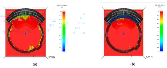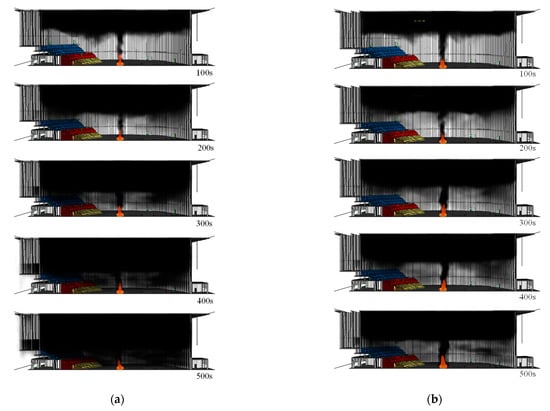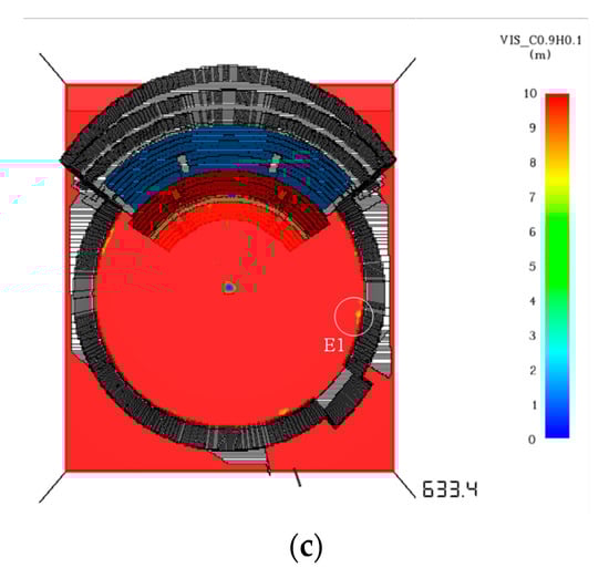 Visibility is an index to reflect the smoke concentration experienced by evacuees in a fire; visibility is an important factor to characterize the smoke hazards. According to NFPA 140, the smoke extraction system should ensure that the visibility of the space below the clear height (usually not less than 2 m) is greater than 10 m in order to provide a maintainable environment for safe evacuation []. Considering that this theater belongs to a large space building, to be conservative, the danger value of visibility is set to 10 m.