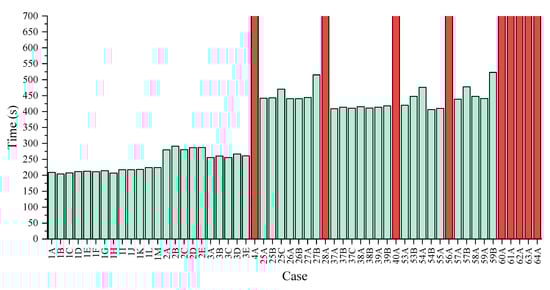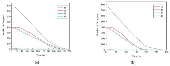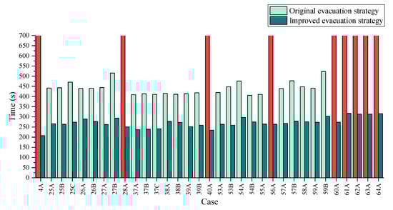 Figure 22 shows the comparison of evacuation time on the first floor before and after adding evacuation stairs in all cases where the evacuation exits are blocked, where the red bar indicates that the evacuation process cannot be completed. It can be seen from Figure 22 that after adding emergency evacuation stairs, the evacuation time of all cases is greatly shortened, which can be controlled within 316.5 s. For the cases that could not be evacuated, such as Cases 4A, 28A, 40A, 56A, and 60A~64A, the evacuation can be completed in a short time, indicating that the increase of emergency evacuation stairs can greatly improve the evacuation efficiency.