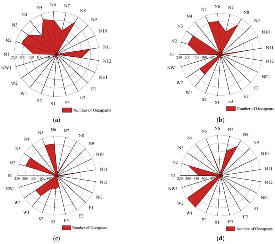 Table 2 shows all clusters of blockages of evacuation exits A1, A2, B1, B2, C1, and C2. As a supplement to Table 2, Figure 8 shows four typical audience rotation situations. In Table 3, the number corresponding to each evacuation exit represents its blocking situation, 1 represents that the evacuation exit is not blocked, such as evacuation exit A1, A2, B1, B2, C1, and C2 of A and B in Figure 8a,b; 0 represents that the evacuation exits is blocked, such as evacuation exits A2, B1, and C2 of C in Figure 8c and evacuation exits A1, A2, B1, B2, C1,and C2 of D in Figure 8d.