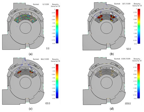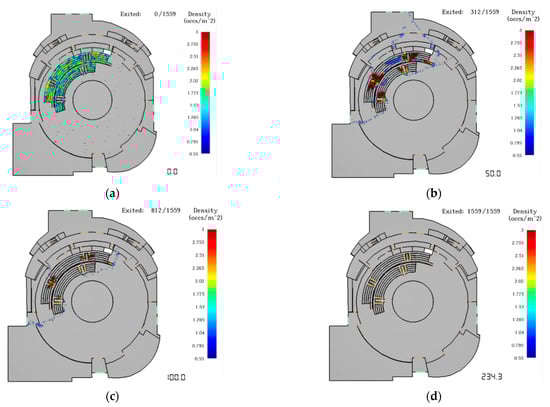 Evacuation process and density distribution of the occupants on the first floor after adding emergency evacuation stairs. (a) Occupant density at 0 s; (b) occupant density at 50 s; (c) occupant density at 100 s; (d) occupant density at 234.3 s.