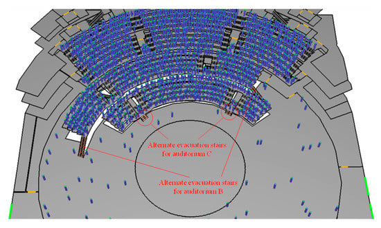 Even under some extreme conditions, the evacuation exits of the auditorium will be completely blocked, so that the audience on the corresponding auditorium cannot leave the auditorium for evacuation, resulting in great potential safety hazards. This has been verified in the pre-evacuation simulation. For example, when auditorium C rotates to a certain angle, the evacuation exits of auditorium C (evacuation exits C1 and C2) may be completely blocked and the audience in auditorium C cannot leave auditorium C through the evacuation exits C1 and C2, while the audience in the other auditoriums has already been evacuated, as shown in Figure 4. Therefore, it is necessary to evaluate the evacuation performance of the theater under various auditorium conditions and provide a reasonable and effective evacuation path scheme for the most unfavorable evacuation scenarios.