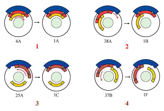 In this paper, we also propose an evacuation strategy based on ideal assumptions: assuming that the rotating mechanism can still operate normally in the event of a fire, then when the evacuation exits are blocked, it is possible to rotate auditorium B or auditorium C to unblock the evacuation exits B1, B2, C1, and C2, which is conducive to reducing the evacuation action time. Figure 23 shows the transformation of Cases 4A, 38A, 25A, and 37B into Cases 1A, 1B, 1C, and 1F by rotating auditorium B and C. Cases 4A, 38A, 25A, and 37B represent four typical cases of evacuation exits blocked. All cases of evacuation exits blocked can be transformed into Cases 1A, 1B, 1C, and 1F by rotating auditorium B and auditorium C. This evacuation strategy is expected to use the existing evacuation conditions to achieve safe evacuation without adding emergency evacuation stairs and fire exits.