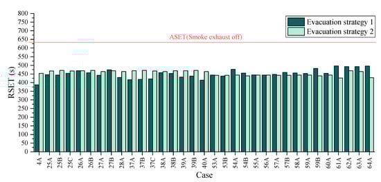 Figure 24 shows the comparison of the required safe evacuation time for the two evacuation strategies. The results show that in most cases, the difference between the two evacuation strategies required for safe evacuation is relatively small. The addition of emergency evacuation stairs and rotating auditoriums can effectively shorten the evacuation action time and ensure that all people can be evacuated in a short time when the theater smoke exhaust system fails. It is worth noting that, while evacuation by rotating the auditorium can be effective in reducing evacuation time, the strategy is based on ideal assumptions with uncertain risks. Given the limitations of rotating mechanisms and the reliability of the power supply, it is not recommended to rely solely on rotating mechanisms to assist with evacuation, but only as an auxiliary evacuation option or as a daily audience departure option.