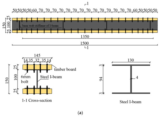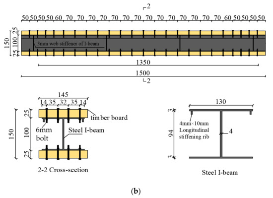 A total of three groups (L1–L3) of TSC I-beam specimens were designed and produced, with two specimens in each group. The span, section height, width, and bolt arrangement of the three groups of beams were the same, whereas only the thickness of the upper and lower flange timber boards and the height of the I-beam varied. The beam length was 1500 mm, the calculated span was 1350 mm, and the section height and width were 150 mm and 145 mm, respectively. The thicknesses of the L1–L3 groups of specimen planks were 25 mm, 30 mm, and 35 mm, respectively, and the corresponding I-beam heights were 100 mm, 90 mm, and 80 mm, respectively. To meet the requirements of the “standard for design timber structures” [11] and “code for design of steel structures” [12], 4.8 grade 6 mm bolts were adopted for testing, and washers were fitted to the nut and surface of the timber board; four rows of bolts were used to connect the components, and the longitudinal spacing between the bolts in the middle span of the composite beam was 70 mm, the end spacing was 50 mm, the lateral spacing between the two outer rows of bolts was 35 mm, and the middle spacing was 32 mm. To prevent local buckling of the upper flange of the I-beam, specimens in groups L1 and L2 were designed for comparison in the form of one sample comprising 4 mm × 10 mm longitudinal stiffening ribs, while the other had no longitudinal ribs. Figure 1 shows the structure of the L1 group of specimens, and the detailed size parameters of the L1–L3 groups of specimens are shown in Table 1 below.