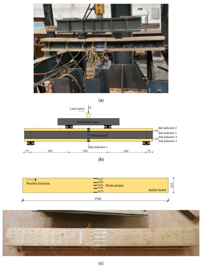 This test was carried out in the laboratory of the School of Civil Engineering, Central South University of Forestry and Technology, Hunan, China. The loading device used was a 100 t reaction force frame with a 100 t hydraulic jack (Manufactured by Xiangtan Zhaoyuan Mechanical & Electrical Co.), and a load sensor was utilized to measure and read the load. The specific loading device layout is shown in Figure 2a. Referring to the Eurocode for timber structures [15], the loading method of three equal points was adopted, and the preloading was set to 20% of the estimated bearing capacity prior to formal loading to verify that the device was operating normally. The formal loading method adopted was that of step-by-step loading. When the load was 0–40 kN, the load increment at each stage was 5 kN, which was maintained for 1 min; above 40 kN, the load increment at each stage was 3 kN, which was maintained for 30 s. The test ended when failure occurred or when the load was greatly reduced.