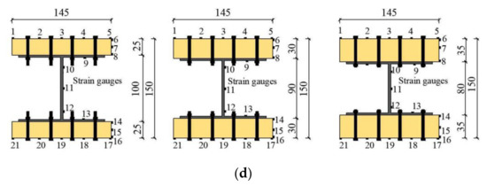 A DH3861 static strain acquisition system and dial indicator were used to measure and read the strain and displacement of the specimen during the loading process. The dial indicator arrangement is shown in Figure 2b; a dial indicator was fitted at the bottom of the mid-span of the beam to measure the mid-span deflection of the beam, and four dial indicators were arranged on the timber boards and I-beam of the upper and lower flanges, at the end of the beam. The dial indicators measured the relative slip between the upper and lower flange timber boards and the I-beam. The strain disposition scheme for each group of specimens was as follows: five longitudinal strain gauges were fitted to the top and bottom timber boards of the beam mid-span to test the normal strain (Figure 2c). On the mid-span section of the beam, the upper and lower three longitudinal strain gauges were evenly positioned along the height orientation of the flange timber boards, and five longitudinal strain gauges were set along the height orientation of the I-beam to measure the normal strain (Figure 2d).