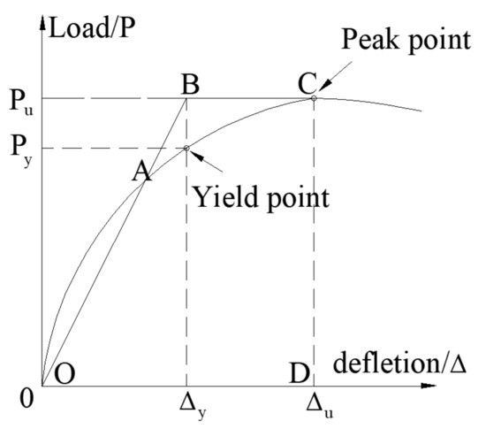 where is the value of the deflection corresponding to the test ultimate load , is the value of the deflection corresponding to the test yield load , and is the area of the trapezoid OBCD.