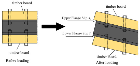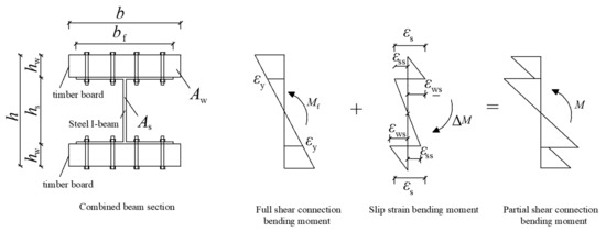 The TSC beams with a partial shear connection slip at the intersection of the timber board and steel beam during bending and no longer satisfy the flat section assumption. Therefore, in order to predict the deflection and flexural load capacity of TSC beams in normal use, following the research of Jingquan Wang et al. [18], this paper uses the combined coefficient method to calculate the flexural stiffness of TSC beams while considering the slip effect. The calculation method and formula of the elastic limit flexural bearing capacity of the composite beam are proposed, which satisfy the following basic assumptions: (1) both timber and steel are ideal linear elastic bodies; (2) a bolt offers a good anti-lifting effect, and the timber board has the same curvature as the I-beam; (3) after slip occurs, both the timber board and the I-beam satisfy the assumption of a plane section; (4) the flexural rigidity of the partially shear-connected composite beam lies between the fully composite connection and the non-composite connection.