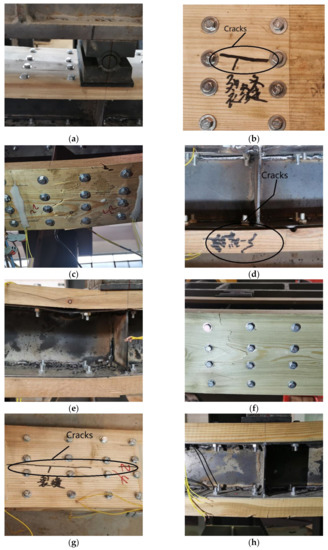 When the L2 group of specimens was loaded to about 85% of the ultimate load, there was a continuous sound, but there was no sign of failure; when the L2-1 specimen was loaded to the ultimate load, the timber fibers at the bottom of the L2-1 specimen were pulled off (Figure 5f), longitudinal cracks appeared on the bottom board of the L2-2 specimen (Figure 5g), and the L2-1 specimen without steel flange no buckled (Figure 5h).