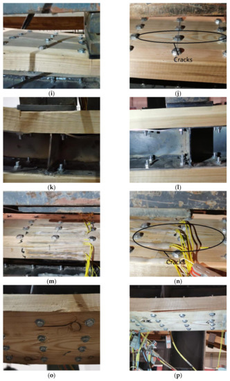 When the specimens in group L3 were loaded to 80% of the ultimate load, small longitudinal cracks appeared in the bending shear section of the top board (Figure 5i,j), with local crushing of the timber flange below the loading point and local buckling of the steel flange (Figure 5k,l). When the loading was continued to the ultimate load, longitudinal cracks appeared exclusively in the bending section of the top board and joined the longitudinal cracks in the bending shear section to form one long crack (Figure 5m,n), and the timber of the bottom board was pulled off and failed (Figure 5o,p).