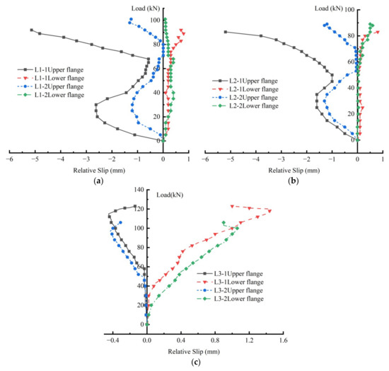 It can be seen from Figure 8 that the slip of the upper and lower flanges of each group of specimens basically increased with increased loading. In particular, the slip of the upper flange of the specimens in groups L1 and L2 increased with the load at the beginning of loading; however, when loaded to 30–40% of the ultimate load, the slip decreased with the increase in load before increasing rapidly again. This was hypothesized to be because the compression deformation of the I-beam flange was larger than that of the timber board at the initial stage of loading, when the bolts were in contact with the whole wall of the I-beam flange. The compression deformation of the I-beam flange was, thus, blocked by the bolts, and its slip reduced, until the entire wall of the timber board made contact with the bolts, and the relative slip between the two began to increase with the increased loading. Table 6 shows the maximum slip values of the upper and lower flanges of each group of specimens, which were essentially less than 1.5 mm. However, the slippage of the upper flange of the L1-1 and L2-1 specimens reached 5.14 mm and 5.2 mm, respectively, which, in the authors’ view, was because the top timber board of these two specimens was relatively thin, and the upper flange of the I-beam was devoid of any longitudinal stiffening ribs. The upper edge of the I-beam had sustained a relatively large deformation under compression, resulting in a larger slip; the top timber boards of the L3 group of specimens was relatively thick, and the compression deformation of the timber board was greater. The L1-2 and L2-2 specimens comprised longitudinal stiffening ribs on the upper edge of the I-beam, which reduced the compression and deformation of the I-beams, thus resulting in smaller slips of under 1.5 mm in both instances.