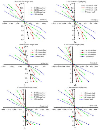 Normal strain diagram for mid-span section: (a) L1-1; (b) L1-2; (c) L2-1; (d) L2-2; (e) L3-1; (f) L3-2.