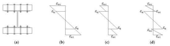 Schematic diagram of normal strain in the cross-section of the composite beam: (a) composite beam; (b) fully rigid connection; (c) strong composite connection; (d) weak composite connection.