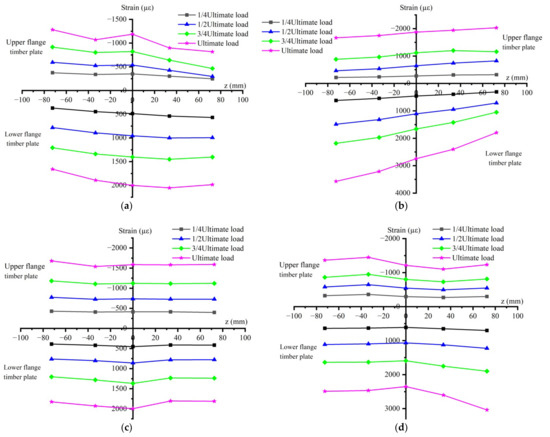 Figure 9 shows the distribution of the normal strain in the mid-span section of each specimen in the height orientation at different loading stages. It can be seen from the figure that, when loaded to 25% of the ultimate load, due to the friction at the timber–steel interface, the gap between the bolt rod and the overall wall remained unchanged, the relative slip between timber boards and I-beam was small, and the overall bending deformation (strain) of the composite beam basically satisfied the assumption of plane section. When the shear force exceeded the maximum friction force between the boards with increasing loading, relative slip occurred between the boards, such that the overall deformation of the composite beam no longer met the assumption of the plane section, but the respective strains of the upper and lower timber boards and I-beam satisfied the plane section assumption.