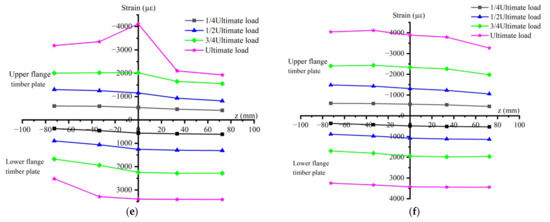 Figure 11 illustrates the distribution law of the normal strain of the upper and lower timber boards in the middle span of each group of specimens along the width direction (transverse plane). In the initial stage of loading, the lateral distribution of normal strain was relatively uniform, and, as the load increased, the distribution of normal strain gradually became uneven. Among other findings, the difference in strain on both sides of the lower flange of the L1-2 specimen and the upper flange of the L3-1 specimen was greater, as a result of material defects such as wood knots and twill, and the side incurring the greater strain was that close to sites responsible for the timber board failure. In general, the lateral distribution of the normal strain of the upper and lower timber board was relatively uniform, indicating that the shear lag effect was not obvious. This was because the width of the I-beam flange was essentially the same as that of the timber flange, such that the shear stress was mainly borne by the steel I-beam, while the shear stress borne by the timber board was low. This also indicated that the change in ratio of the composite beam timber board thickness to I-beam height composite in this study had a small effect on the shear lag effect of the composite beam.