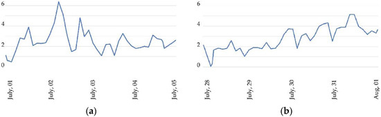 Wind speed in m/s (a) from 1–5 July, Zagreb; (b) from 28 July–1 August, Split. All data was taken from typical meteorogical year based on years 2005−2020 [5].